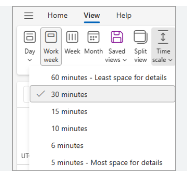 Open your Outlook Calendar, click on View at the top of the window, then select Time Scale. You’ll see several options for how your calendar blocks are stacked—choose the one that makes your day easiest to read. Shorter intervals (like 15 minutes) give you more detail, while longer intervals (like 60 minutes) give a cleaner overview.